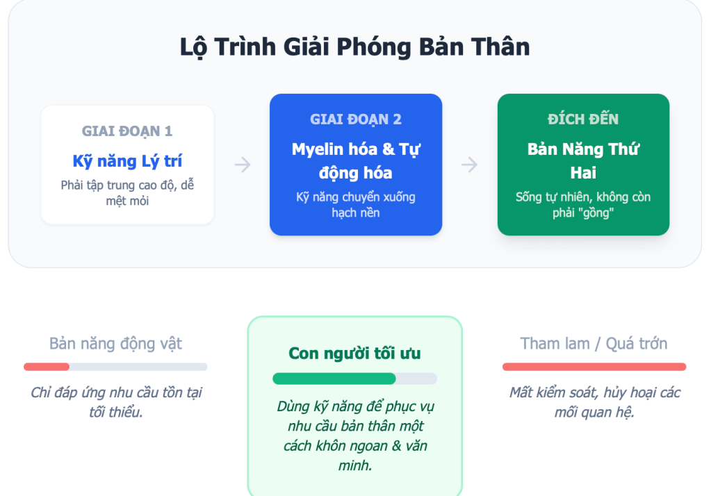 Trong nhịp sống hối hả của thế kỷ 21, chúng ta thường nghe về việc phải rèn luyện kỹ năng để thành công. Tuy nhiên, có một sự thật ít người thừa nhận: việc phải gồng mình sử dụng kỹ năng mỗi ngày thực chất rất mệt mỏi. Nó giống như việc bạn phải chạy một phần mềm nặng trên một hệ điều hành cũ kỹ, khiến bộ não luôn trong tình trạng quá tải. Câu hỏi đặt ra là: Tại sao chúng ta không biến những kỹ năng phức tạp đó trở thành một loại “bản năng thứ hai” để sống một cách tự nhiên và nhẹ nhàng hơn?