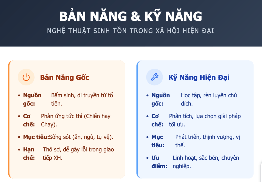 Sự khác biệt lớn nhất nằm ở chỗ bản năng giúp ta tồn tại, nhưng kỹ năng mới giúp ta phát triển. Trong xã hội hiện đại, những mối nguy không còn là hổ dữ hay thiên tai, mà là áp lực từ các thương vụ triệu đô, những mối quan hệ xã giao phức tạp hay sự đào thải khắc nghiệt của thị trường lao động. Nếu chỉ sống bằng bản năng gốc, bạn sẽ dễ dàng rơi vào bẫy của cảm xúc, dẫn đến những quyết định sai lầm. Nhưng nếu chỉ sống bằng kỹ năng một cách máy móc, bạn sẽ thấy mình như một cỗ máy đang diễn vai, mất đi sự kết nối thực sự với chính mình.