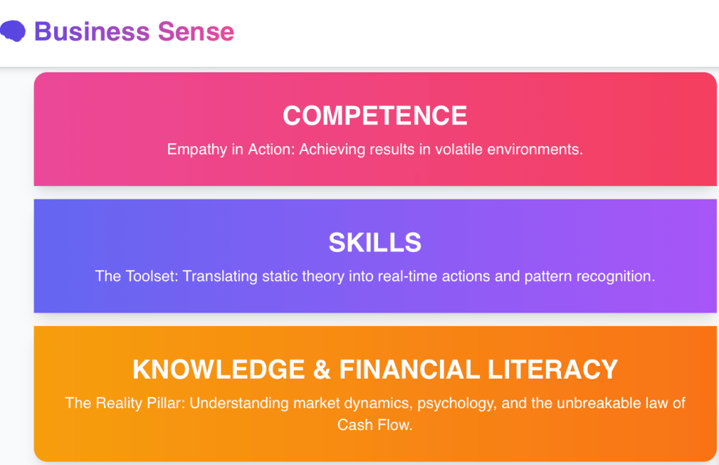 - Knowledge (The Foundation): This is the theoretical bedrock—understanding market dynamics, finance, accounting, and human psychology. It is knowing what keeps your customer awake at 3:00 AM. Without this solid base of information, your intuition has no data to process, leaving you with “guesses” rather than “sense.”